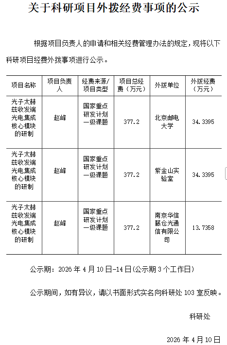关于科研项目外拨经费事项的公示